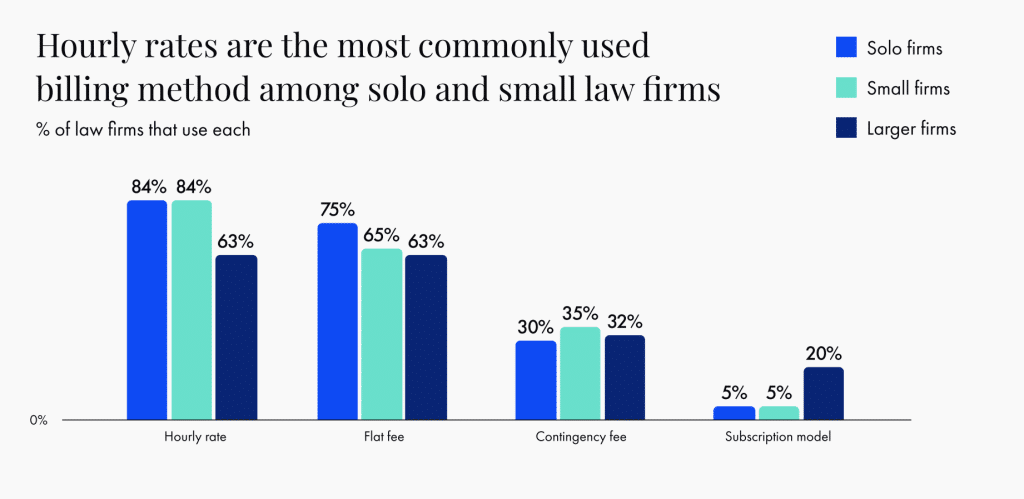 Hourly billing still dominates among solo and small firms, but flat fees are gaining traction. Source: 2025 Legal Trends Report by Clio
