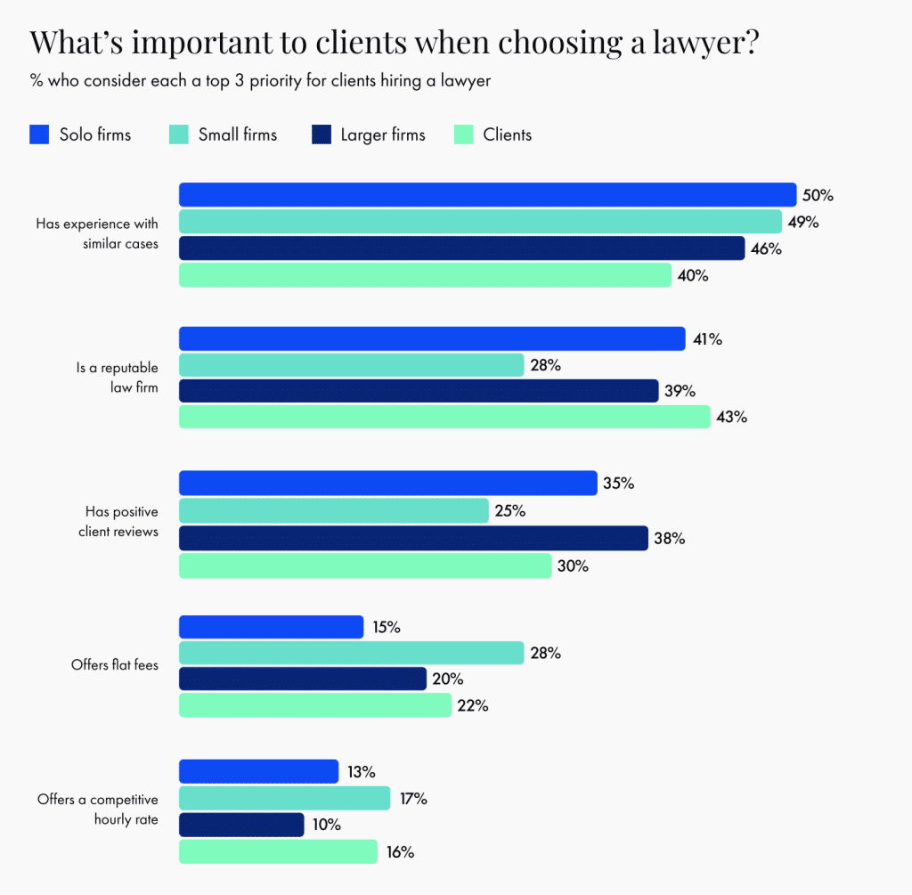First, clients rank “experience with similar cases” as a top priority, and solo and small firm lawyers largely agree. But when it comes to positive reviews and firm reputation, lawyers tend to rate those slightly lower than clients. For example, 43% of clients consider a firm’s reputation a top-three factor, while only 28% of small firm lawyers assume the same.
